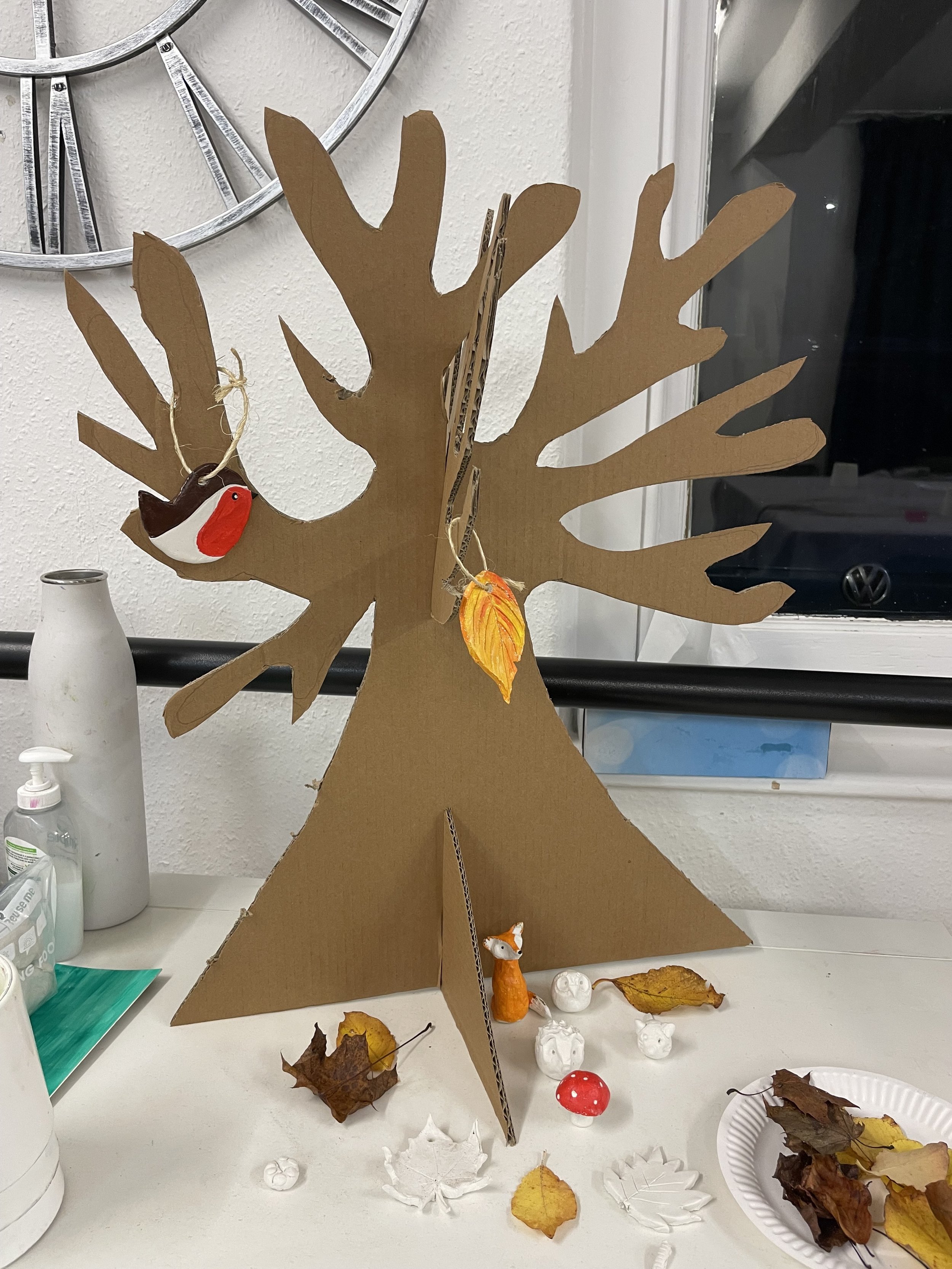 Our sculpture and drawing activities began with the idea of a simple cardboard tree, a symbol of the woodland, cut from discarded packaging—material originally made from wood pulp, which comes from the trees in our landscape. In our first woodland session, the children shared their observations of the changes in the woods, fields, and gardens during autumn and chatted about how the leaves shift in colour, fall to the ground, and leave behind bare branches that reach toward the wintery sky. We talked about the woodland as a habitat for living things and our young artists found inspiration in the plants and animals that thrive on the forest floor or in the tree canopy during this time of year to create their own miniature clay models to display alongside The Art Room tree.